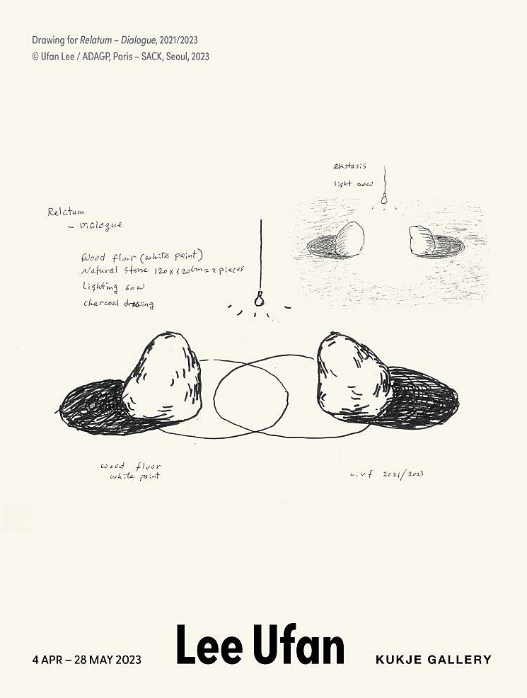 국제갤러리는 2023년 4월 4일부터 5월 28일까지 이우환의 개인전을 개최한다. 2009년 이후 국제갤러리에서 열리는 두 번째 전시이자, 부산시립미술관의 '이우환 공간' 설립(2015)을 제외하면 국내 관람객들이 12년 만에 맞는 작가의 개인전이다. 무료로 관람할 수 있지만 사전예약을 꼭 해야 한다. 네이버예약에서 알렉산더 칼더의 전시와 함께 예약가능하다. 1관의 2개 공간과 2관 2층, 그리고 정원에 걸쳐 전개되는 이번 전시는 이우환의 1980년대 작품부터 근작까지 아우르는 조각 6점과 드로잉 4점을 선보인다. 전시장의 메인 무대를 장악하는 그의 조각들은, 그가 1956년에 일본으로 이주해 전위적인 미술운동인 모노하를 주도하기 시작했던 1968년과 동일한 연도에 처음 제작한 이래 오늘날까지 꾸준히 작업을 이어 온 <관계항(Relatum)> 연작의 연장선에 있다. 이우환은 무에서 시작하여 자기 자신의 표상으로서의 표현을 만들고 그것을 대상화하는 대신, 현실과 맞물리는 현상의 파편으로서의 작업을 보여주고, 타자 또는 세계와의 교류에 열려 있는 표현으로서의 작업을 만들어낸다. 이우환은 자신의 모든 조각들을 '관계항(relatum)'이라 제목 짓고 여기에 종종 부제를 붙이는데, 이때 부제는 가능한 연상을 도울 뿐 확고한 해석을 허락하지는 않는다. 규정지을 수 있는 '관계' 대신 관계를 맺고 있는 주체를 의미하는 '관계항'을 제목으로 선택한 데에는, 작품의 개별 요소들이 끊임없이 맥락이 변화하는 유동적인 관계에 놓이도록 하려는 작가의 의도가 깔려 있다. 자연을 상징하는 돌, 그리고 산업 사회를 대표하는 강철판 등 작업의 요소들과 함께 하나의 ‘관계항’으로서 작품 공간에 직접 개입하게 되는 관람객은 두 사물의 대화에 참여하고 있다고 느끼거나 침묵 중에 진행되는 대화를 명상하듯 관찰하며 자아와 타자의 공생(co-presence)을 생각하게 된다. "돌은 시간의 덩어리다. 지구보다 오래된 것이다. 돌에서 추출된 것이 철판이다. 그러니까 돌과 철판은 서로 형제 관계인 것이다. 돌과 철판의 만남, 문명과 자연의 대화를 통해 미래를 암시하는 것이 내 작품의 발상이다." 이우환이 두 요소의 공생에 대해 위와 같이 소회 한 바, 그의 작품에는 공백이 있고, 공명이 있고, 상호 충돌하여 발생하는 에너지가 있다. 그리하여 내부와 외부가 교통 하는 가변성의 세계, 즉 '무한'을 작품 속으로 끌어들인다.