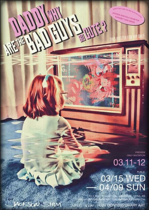 어느 날 잭슨 심은 만화를 보던 어린 딸을 웃게 만드는 것이 영웅 주인공이 아닌 화를 내는 악당이라는 것을 발견하고 그의 캔버스에 등장하지 않았던 악당 캐릭터들을 그려내기 시작했다. 그의 자유로운 붓질과 원색적인 색감 또한 딸에 대한 관찰에서부터 시작되었다. 딸과 색칠놀이를 할 때 정해진 가이드라인이 없이 자기 마음대로 자유롭게 색칠하는 아이로부터 강한 조형적 자극을 받은 것이다. 이번 전시 DADDY WHY ARE THE BAD GUYS SO CUTE? 는 2022년 가을에 선보인 핑크 에디션에 이어 악당 에디션으로, 만화 속 영웅인 주인공이 아닌 악당 중심으로 전개되며 신작 20여점을 입체적으로 선보인다. 잭슨 심의 대표적인 알파벳 카드 시리즈 속 익살스럽고 생생한 표정과 캐릭터의 제스처, 채도 높은 색감은 그의 회화적 특성으로 잡아왔다. 추상화로 재해석되어 생명력을 얻은 악당 캐릭터들은 확대된 알파벳 카드 위에 안착하여 작가의 분신처럼 그의 유연한 내면과 솔직한 욕망을 드러낸다. 악당 캐릭터는 주인공보다도 영원히 잊히지 않는 존재로서 우리 곁에 남아있다. 나쁜 악당에게 반전의 모습이 있기를 바라는 마음이 있었던 것일지도 모른다. 유년 시절에 본능적으로 느꼈던 악당에 대한 감정을 따라 현재의 시간에 도달하여 어른의 눈으로 바라보면서 어쩌면 그들이 우리의 현실과 가장 닮아 있었음을 깨닫게 될지도 모른다.